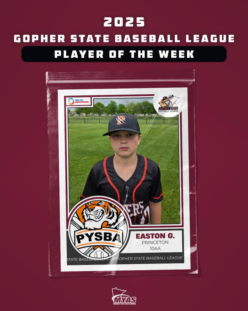 Easton's excellent hitting record and exceptional sponge like catching skills behind the plate has made him standout amongst his teammates. His consistently positive team spirit makes him an ideal candidate for player of the week. He is a true team player and vital part of the team's success.